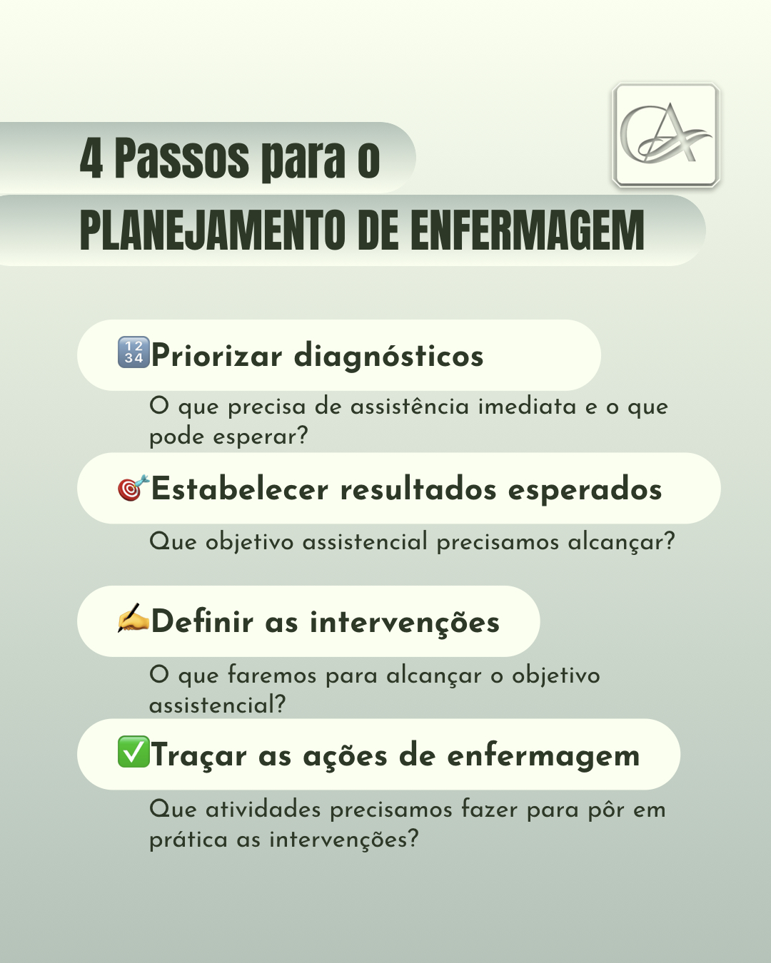 A seguir, descrevo o caminho que você deve percorrer passo por passo para que a assistência de enfermagem seja planejada.
